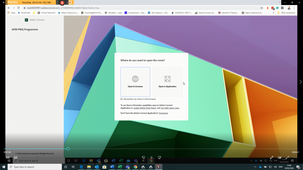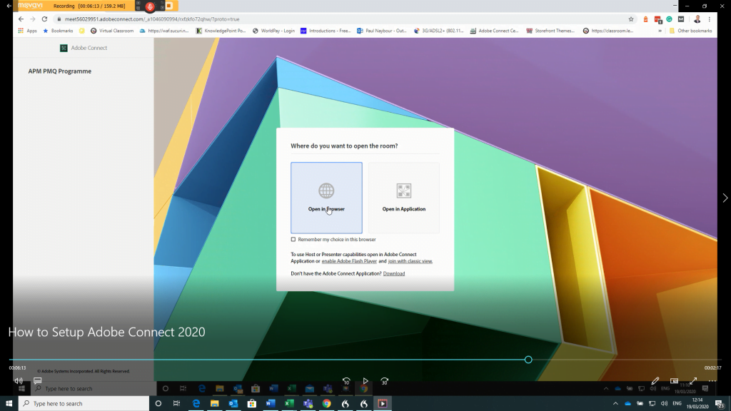 So when we enter the room here you have a couple of choices. The first choice is to download the application, and that’s the best way of doing it. What this is going to do is download and install a small app and I’ve got it already. To install the app, you can always press download here and then open installer run and launch it, just like any other software. Some corporates may not have rights to download applications and install them, so in that case, you would use the web browser version, see more below. It’s worth trying because many corporate will allow known apps like Adobe Connect.