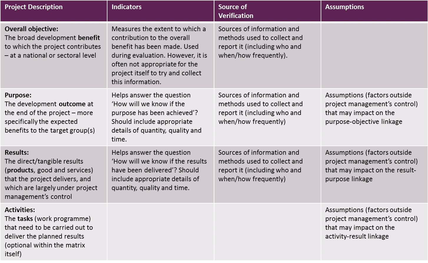Having defined the purpose the project and selected preferred strategy the next is to ensure that the planned activities have clear linkage back to the overall benefit that we hope to deliver. This is done by using the log frame structure the log frame structure shown below links the overall objective of the project to the activities being undertaken. The overall objective of the project is often a strategic development goal linked often to national or international standards. This is supported by the project purpose which is often more local and defines the tangible or intangible benefits to be delivered by the project. The next level down the results or the outcome of the project seeks to achieve finally the lowest level we have activities that produce deliverables as part of the project plan. The logical framework uses a clear the main clincher to make sure that if the activities are completed results are achieved if the results are achieved the purpose is achieved if the purpose is achieved in the overall outcome. This clear thinking is so often missing from projects and products are produced but no benefits are derived.